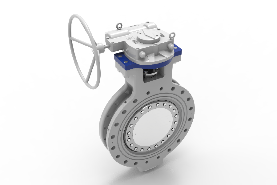 A continuous T-profile robust sealing ring seals the seat face and is maintained on the disc’s periphery by a holding ring, which prevents the sealing ring from tumbling out. The sealing ring is forced against the seat face in the closed state, establishing a snug fit on downstream and upstream ends. And because of the double eccentric disc design, the sealing ring is fully unstressed in the open position.